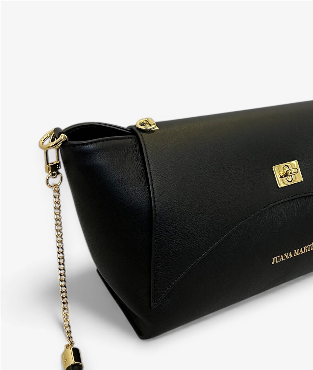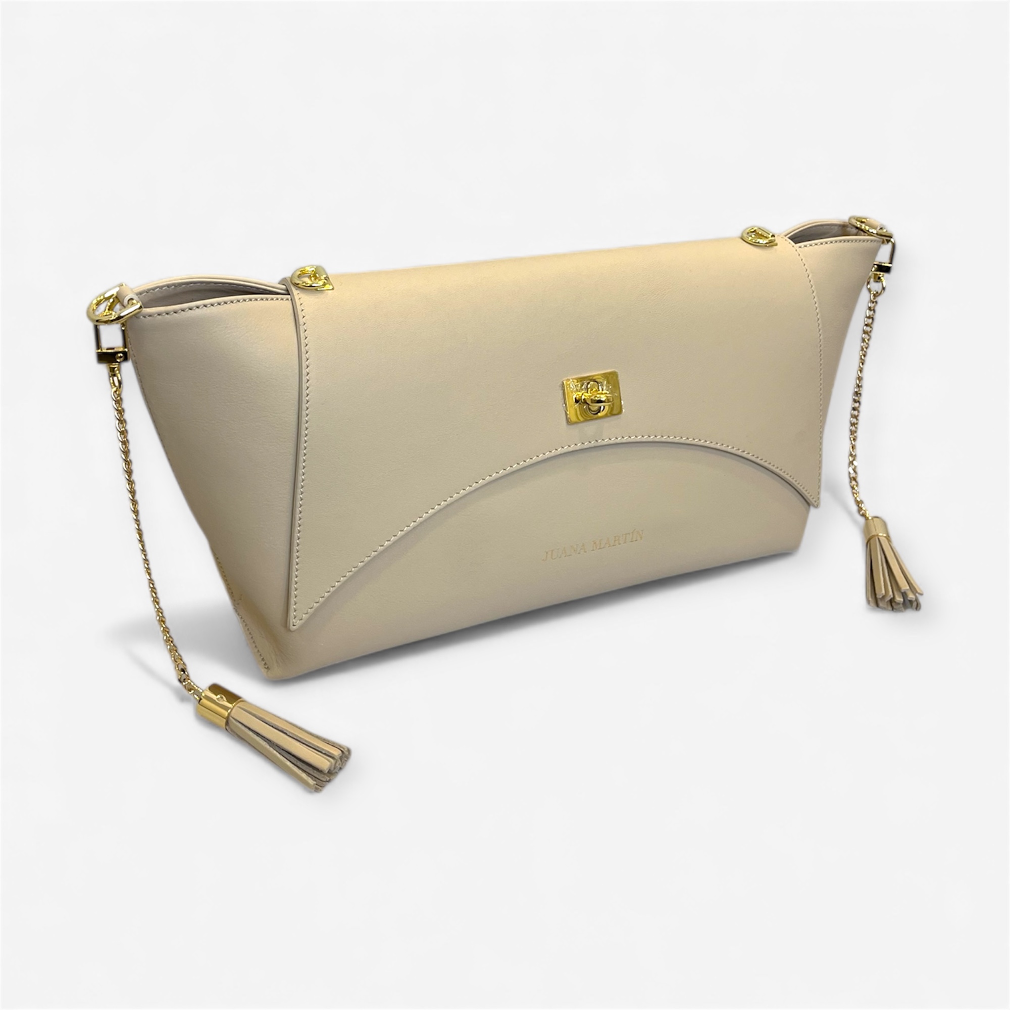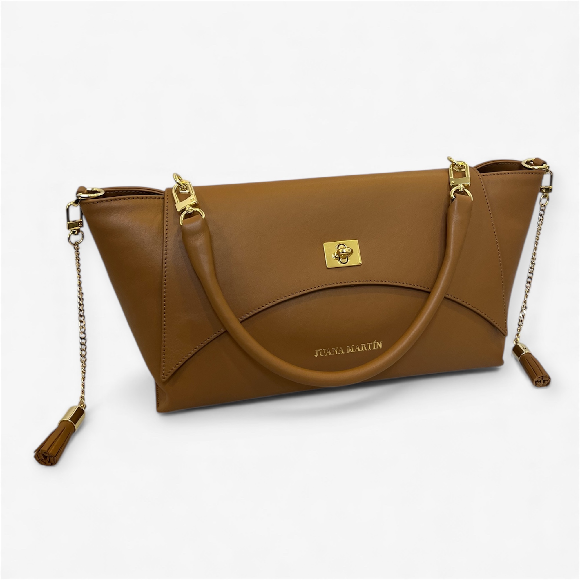 Bolso de tamaño medio de piel con grabado JUANA MARTÍN fabricado a mano en Ubrique, España. Bandolera de piel desmontable y accesorios de borlas de piel. Cierre de metal dorado e imanes en las esquinas laterales de la solapa. Interior forrado de piel y bolsillo cerrado con cremallera.