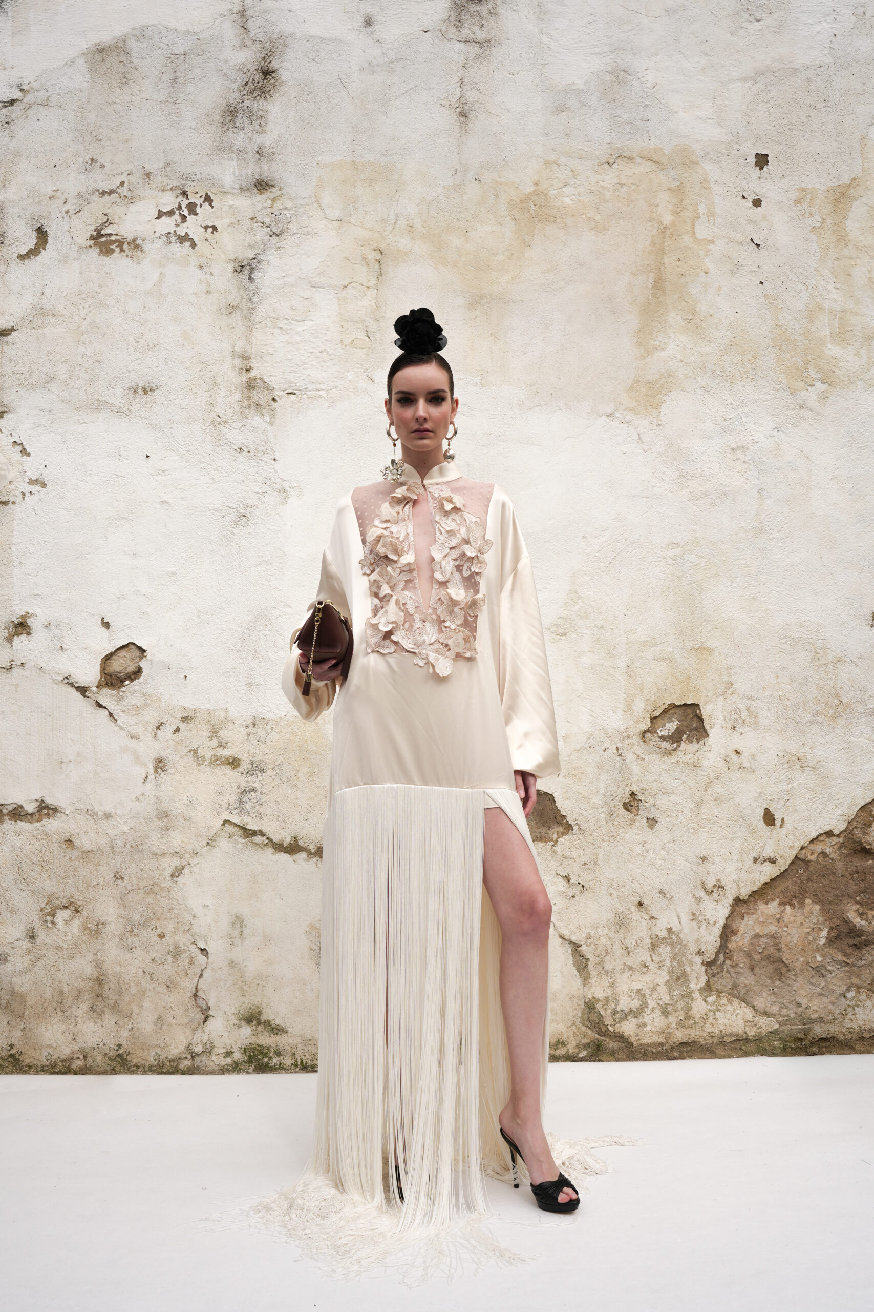 Caftan de satén percherin bordado con flores superpuestas terminado en flecos de seda extra largos
