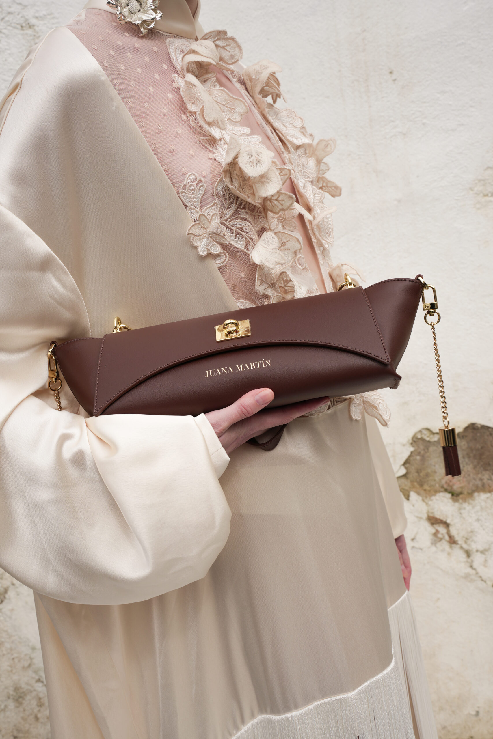 Estilo romántico y artesanal. La delicadeza se convierte en protagonista en este diseño. Las aplicaciones florales en relieve aportan volumen y riqueza artesanal, mientras los flecos introducen movimiento y carácter.