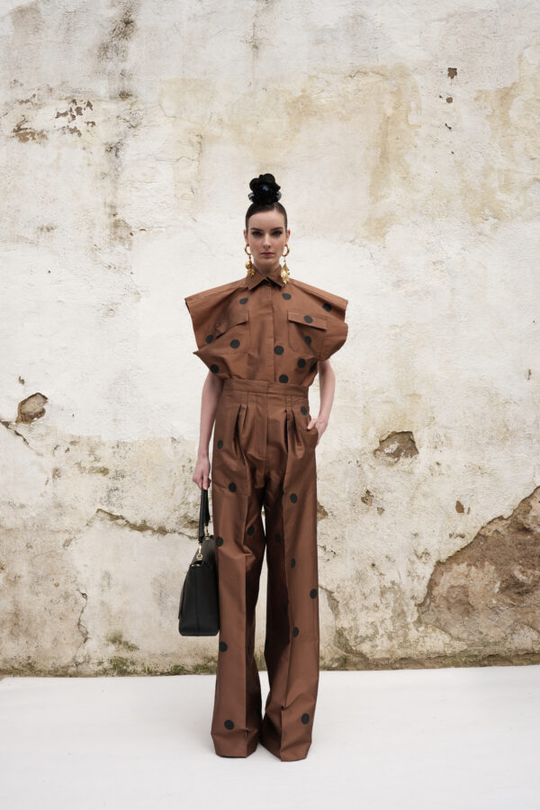 Pantalón de tafetan en traje dos piezas de pantalón y camisa con lunares estampados en vilio