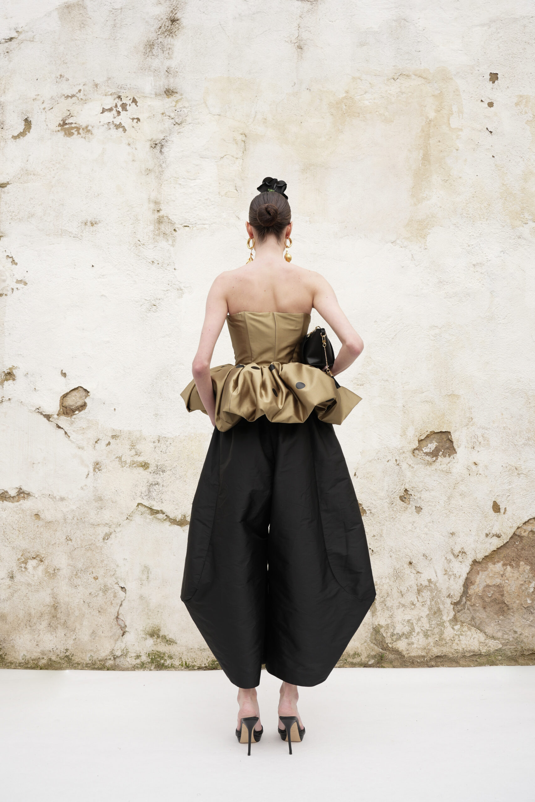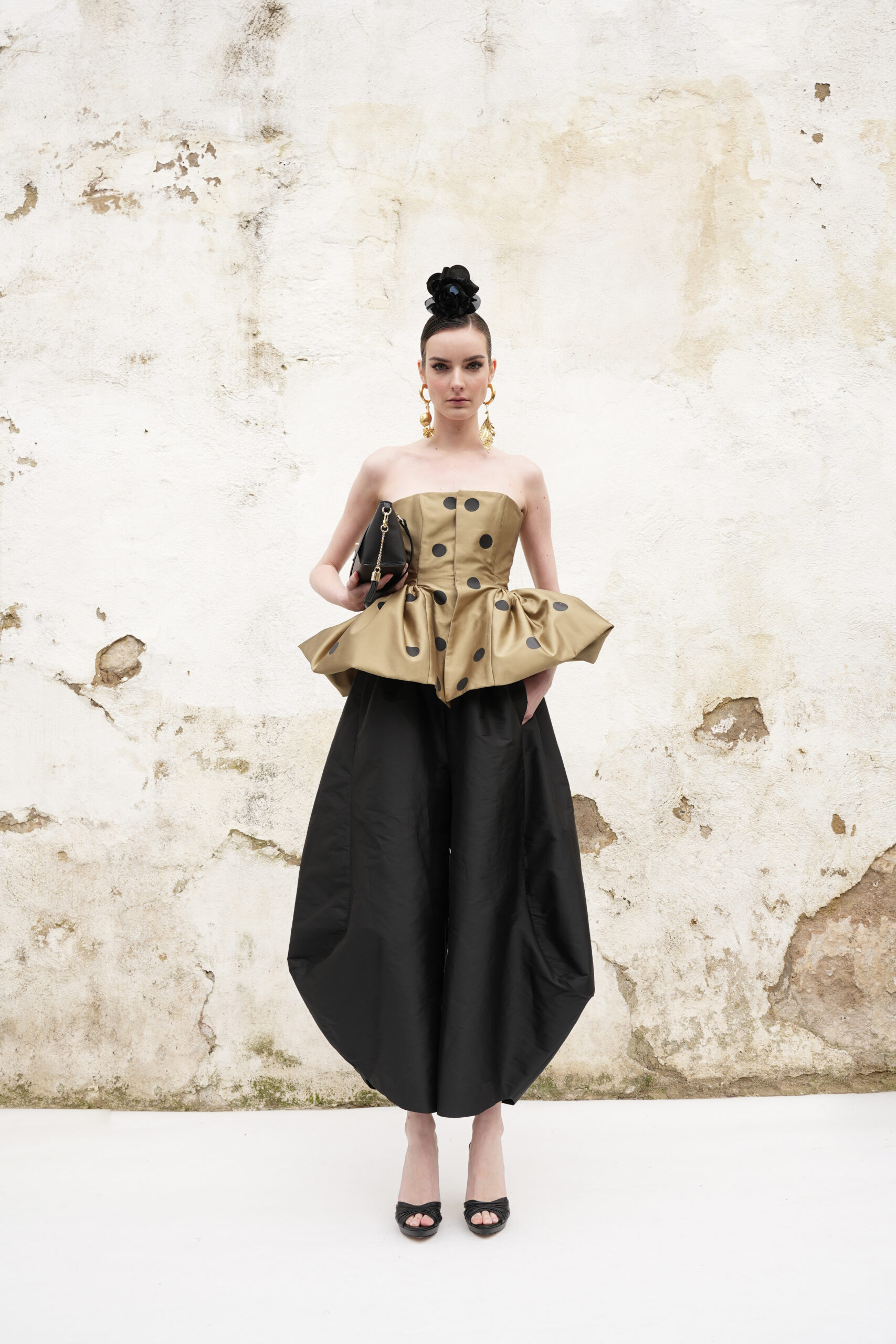 Conjunto a medida en tafetán moca de patantalón japo y corpiño peplum estampado con nunares en vinilo negro